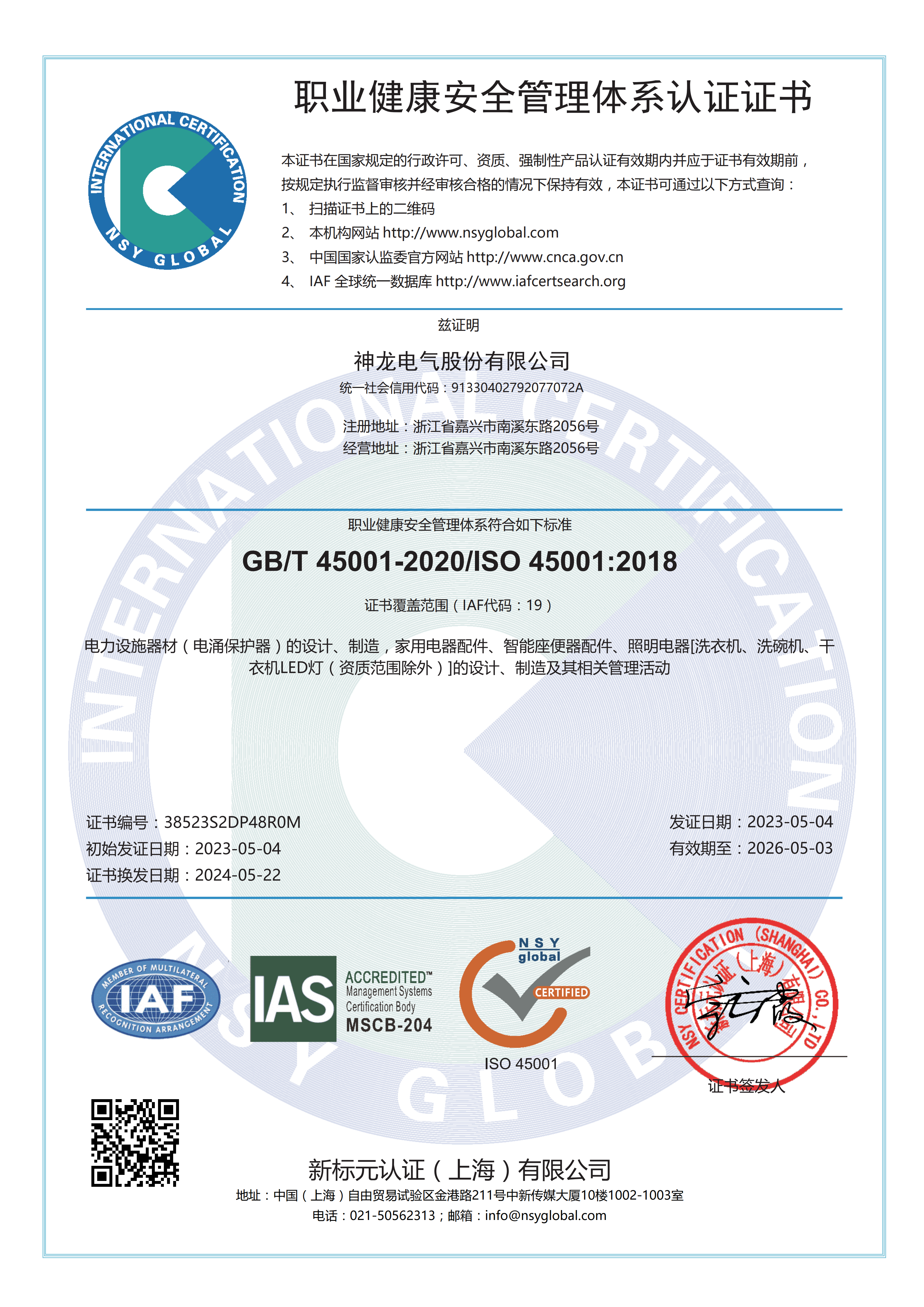 职业健康安全管理体系认证证书