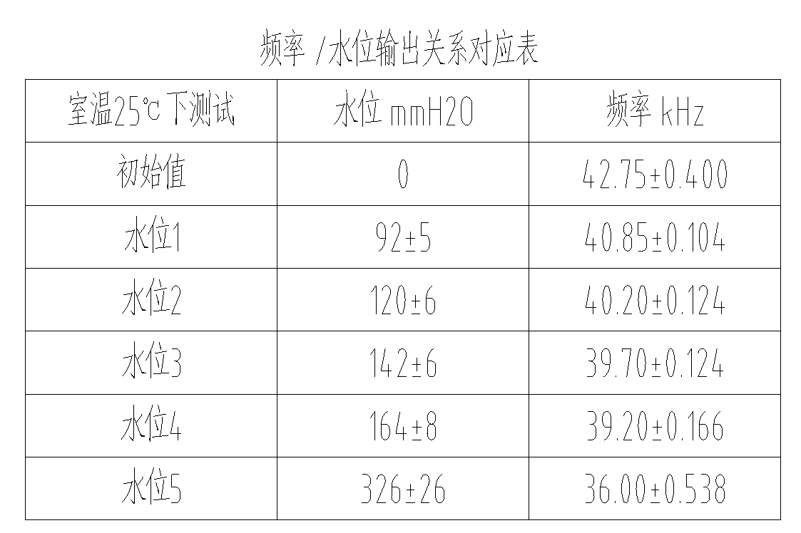 | 耐湿性 | 在温度为40℃±2℃,相对湿度为90%~95%的环境中放置168h后,甩干内部积水,擦干外表面的水珠,再在常温、常湿条件下下放置2h后,传感器水位变化在±15mm范围内。 | |