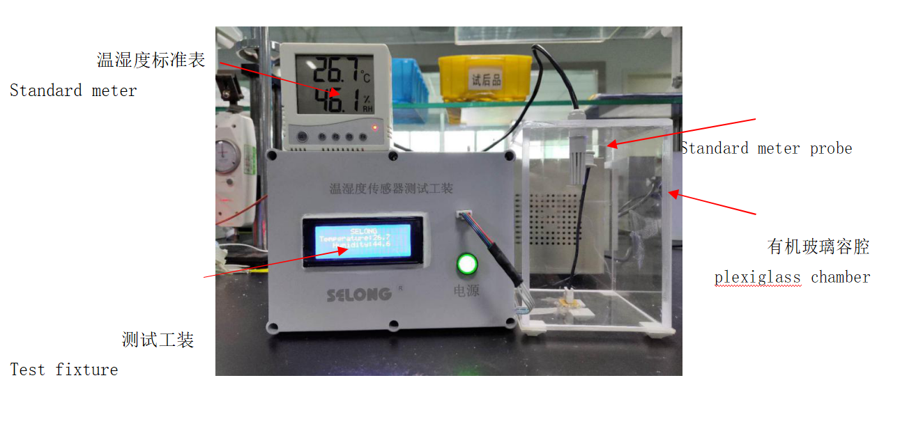 1、测试方法:常温常湿环境下测试,将产品和温湿度标准表探头同时放置在有机玻璃腔体内,